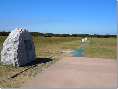The rail below the plane in the picture of their first flight above is the rail in front of the rock below (or a replica). The rock is where the plane first lifted off and the 4 stone markers in the distance are the landing points for the 1st 4 flights. Additionally they didn’t make any more flights that year after the 4 because the wind picked up and tossed the plane end over end breaking it into pieces.